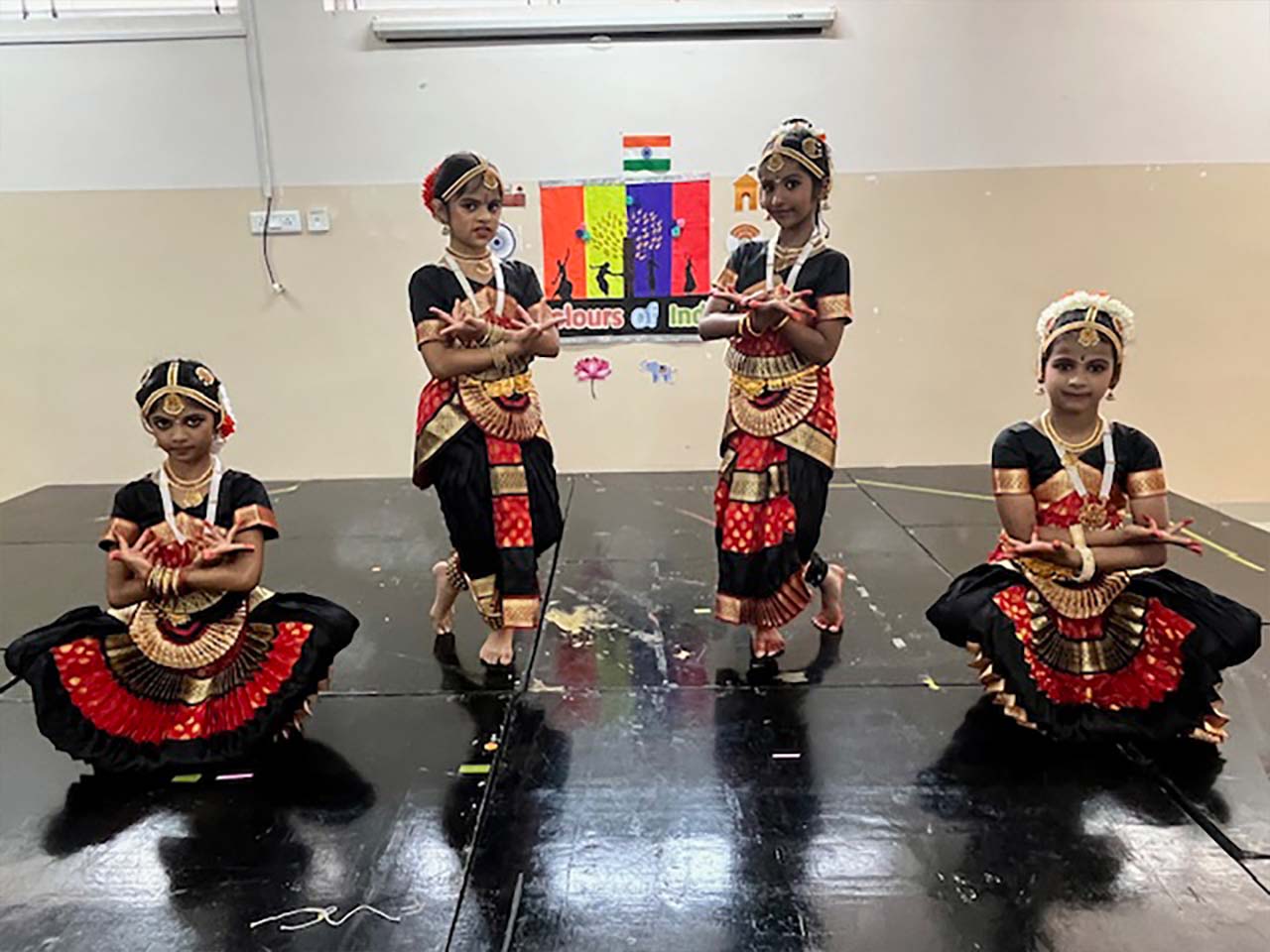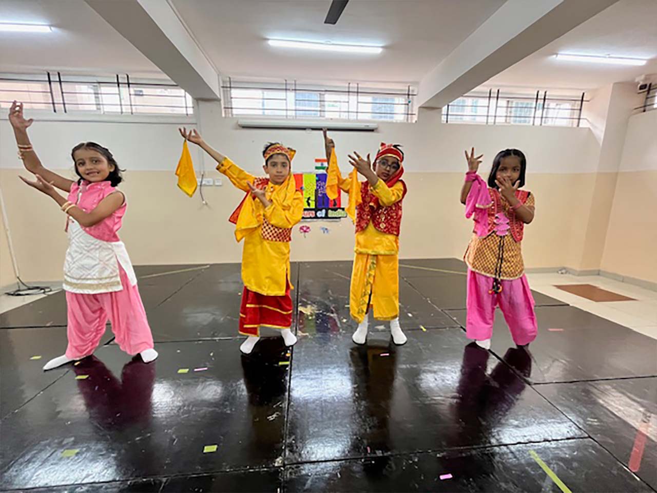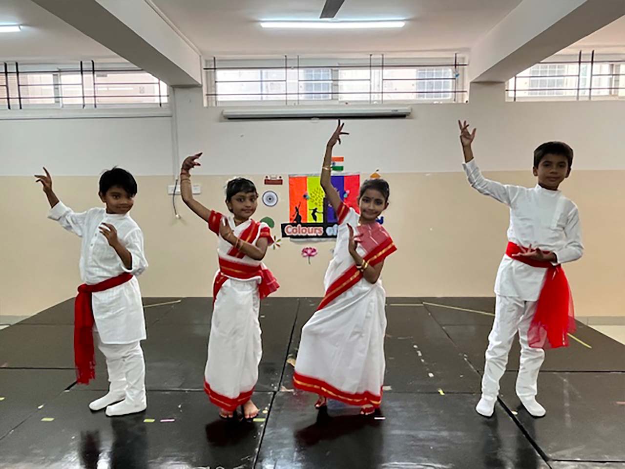 The children confidently presented unity in diversity through a musical show where 2 aliens stationed their spaceship above India to witness the diverse culture of India and to add some colours to their journey. They travelled Kashmir-The heaven on Earth, Panjim-A beautiful coastal place, Allepey-God’s own country. They saw different languages are spoken to these different parts of India. They also travelled to Western part during Garba festival and enjoyed the garba dance. Then, they went to Southern part and saw a beautiful dance performance called Bharat Natyam in a temple. They travelled to Eastern part during Sankranti and Western part during Baishakhi and thoroughly enjoyed Bengali folk dance and Bhangra dance. The aliens were amazed by the unity this country display despite of vast diversity in culture and languages.