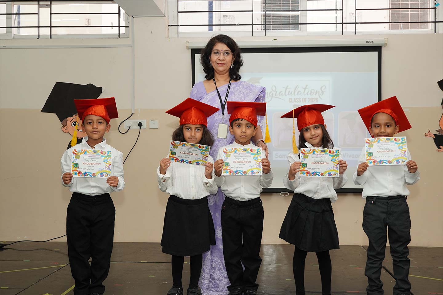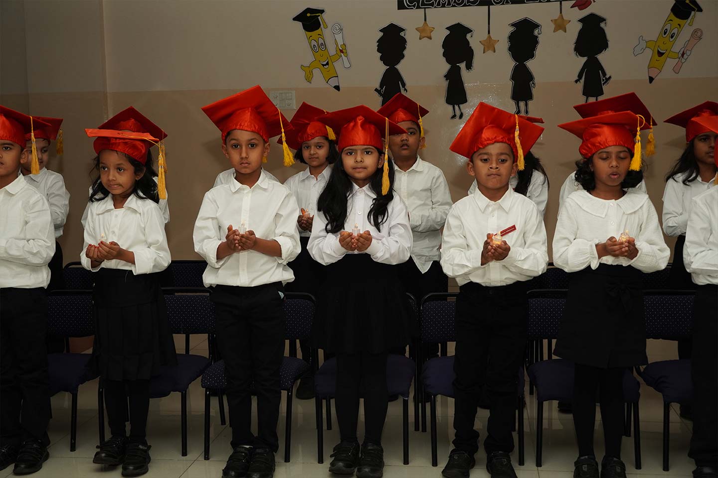 The event began with the KG 2 students walking gracefully down the aisle, holding lamps that symbolised hope, knowledge, and the bright future ahead. They were accompanied by their KG 1 and KG 2 class teachers, whose care and guidance have supported them through these formative years.